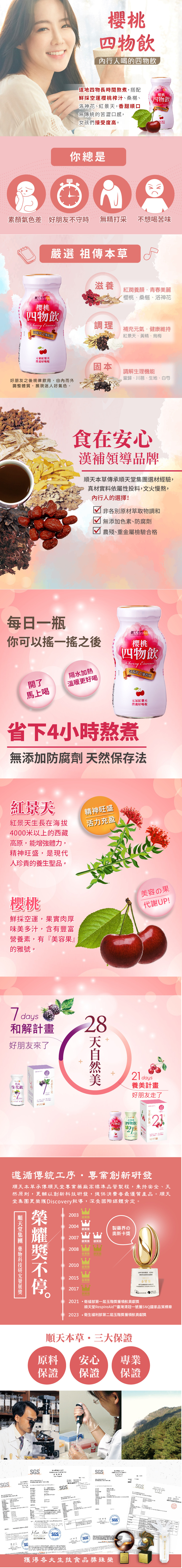水、紅棗、糖、當歸、生地、白芍、川芎、黃精、桑椹、洛神花、烏梅、紅景天、櫻桃鮮榨汁、玉米糖膠、櫻桃香料、桂枝