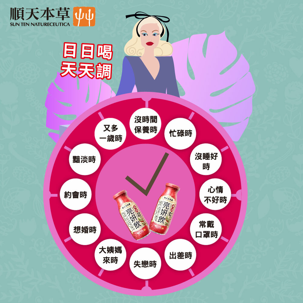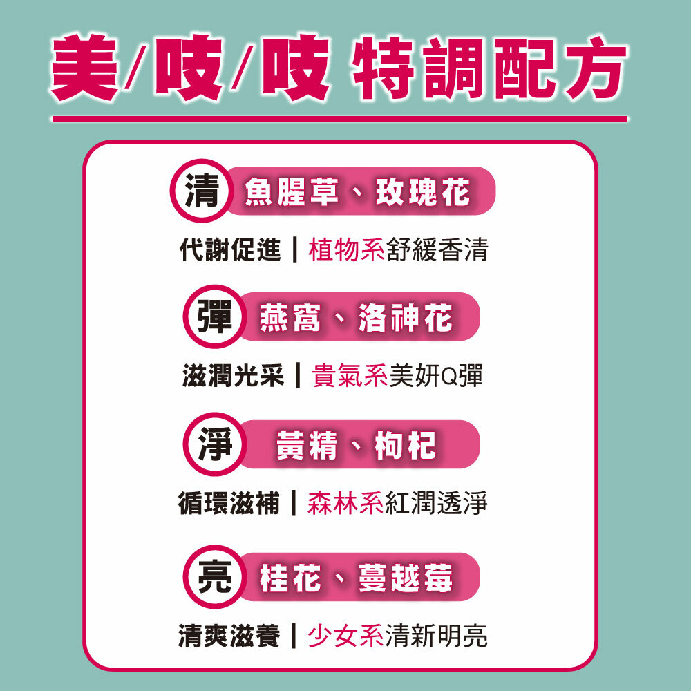 水、糖、蔓越莓綜合汁(蘋果汁、蔓越莓汁、梨子汁)、洛神花、黃精、枸杞、魚腥草、桂花、玫瑰花、甜菊葉、檸檬酸、冰糖燕窩(水、冰糖、燕窩)、維生素C(抗氧化劑)、檸檬酸鈉