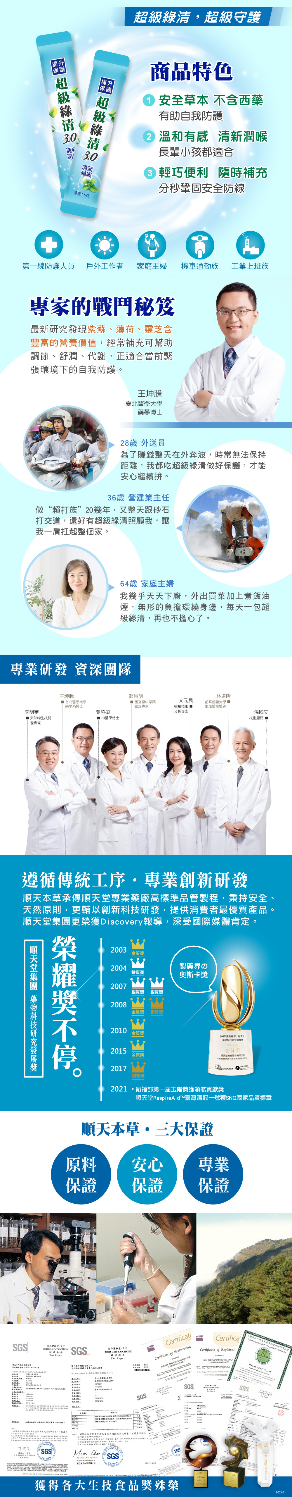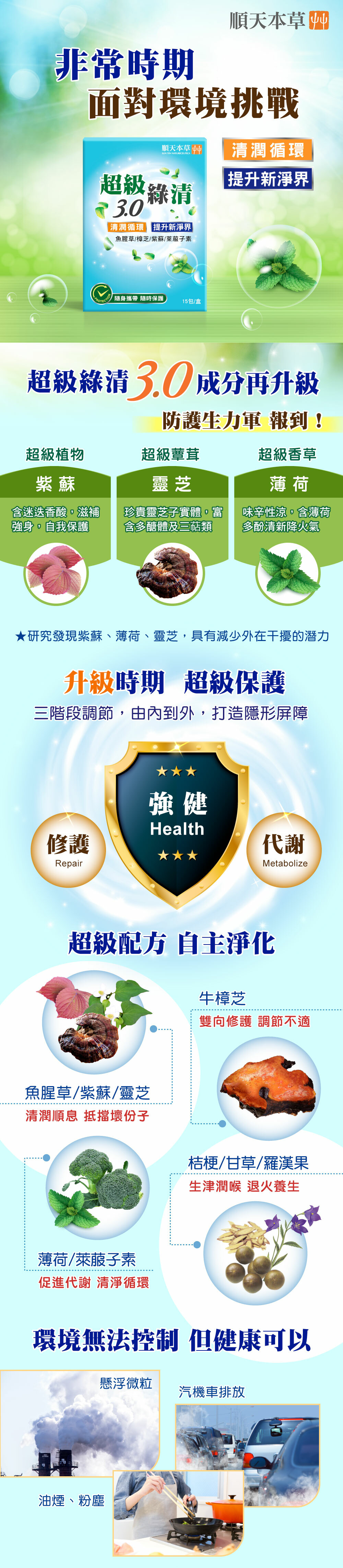 超級綠清嚴選萊菔子素、魚腥草,搭配樟芝、薄荷、紫蘇等經典養護成分,體內環保代謝調理、舒適淨對流,非常時期幫助生津潤喉、健康維持。