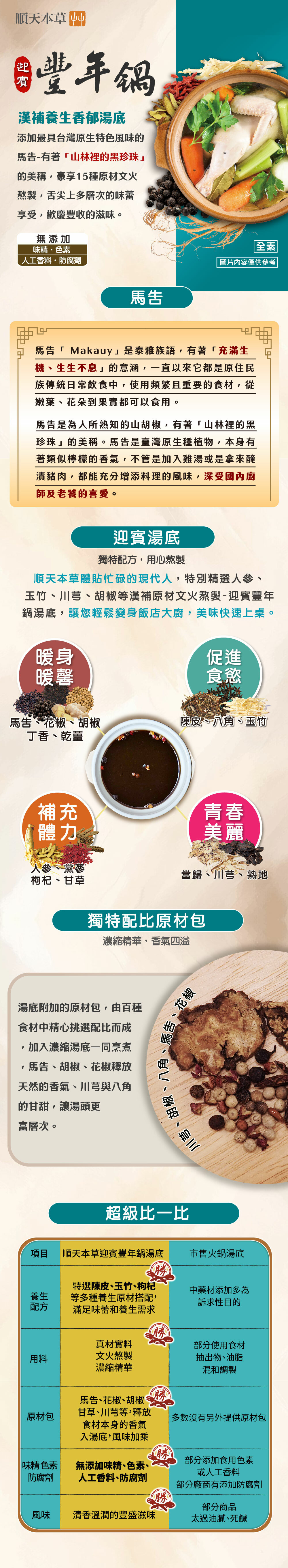 湯底包:水、當歸、鹽、川芎、玉竹、桂枝、酵母萃取物、黃耆、糖、紅棗、枸杞、乾薑、黃精、人參、荳蔻、陳皮、靈芝子實體(Ganoderma Lucidum(Leyss.:Fr)kart.,固態培養)