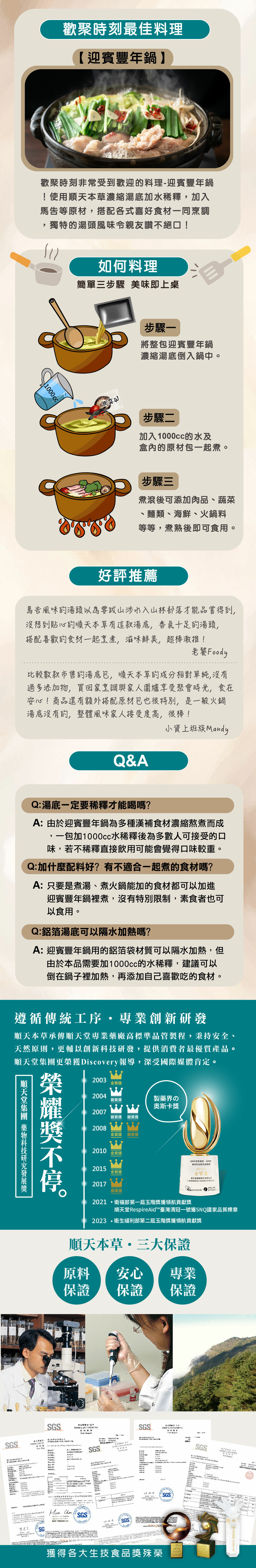 每份可供3-4人食用。 每包湯底倒入鍋中,加入1000c.c.水及原材包,煮滾後可依個人喜好添加各類食材,煮熟後即可食