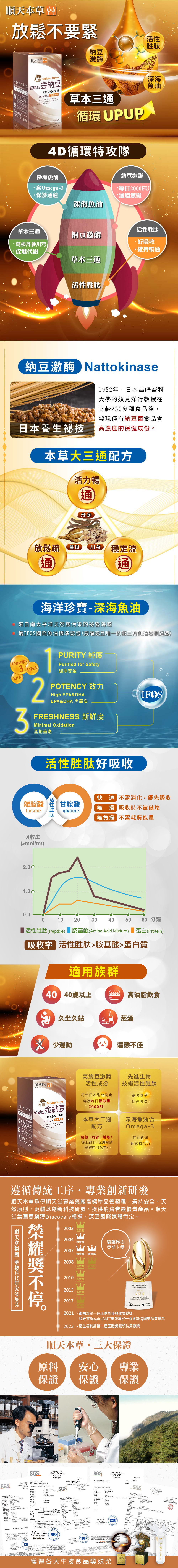 精緻魚油(含EPA、DHA)、維他命E、馬鈴薯澱粉、葛根、納豆發酵粉末(納豆菌發酵物(含納豆激酶)、微結晶α-纖維素、麥芽糊精)、丹參、川芎、大豆卵磷脂、脂肪酸甘油酯、L-離胺酸、L-甘胺酸