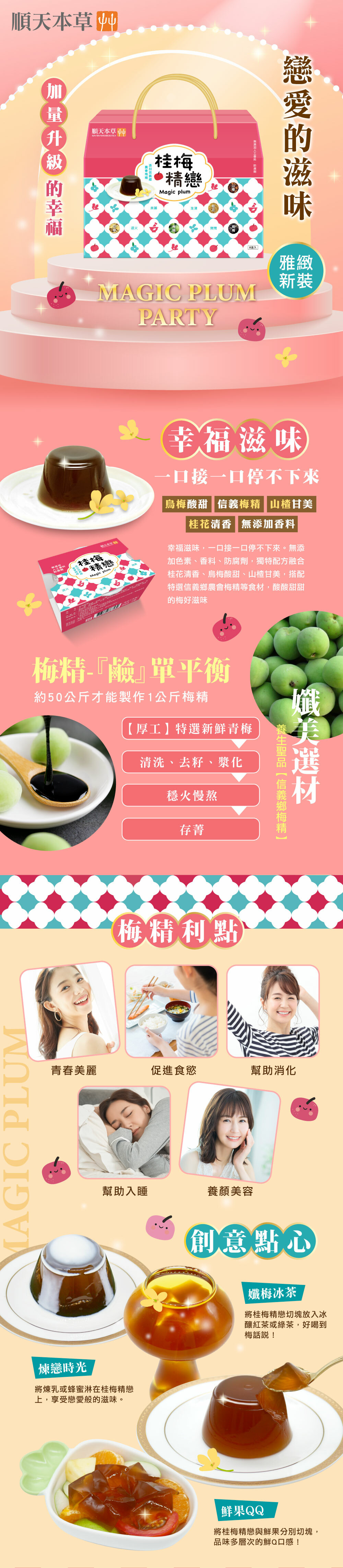 水、糖、果糖、烏梅、山楂、鹿角菜膠、蒟蒻粉、桂花、檸檬酸鉀、檸檬酸鈉、刺槐豆膠、甘草、異抗壞血酸鈉(抗氧化劑)、胺基乙酸、梅精