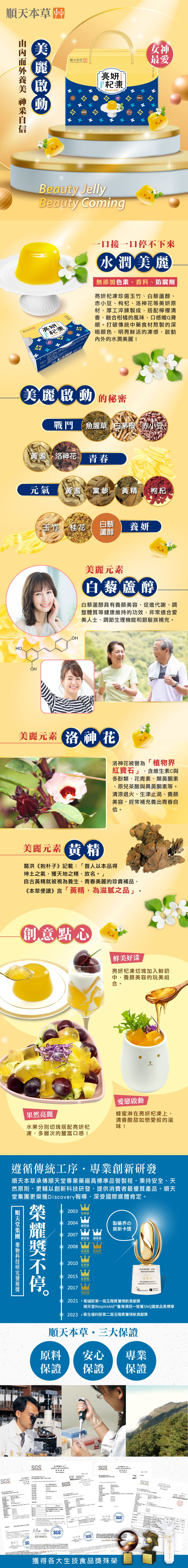 水、糖、柑橘汁、果糖、檸檬汁、鹿角菜膠(鹿角菜膠、氯化鉀、糊精)、蒟蒻粉、檸檬酸、檸檬酸鉀、檸檬酸鈉、刺槐豆膠、異抗壞血酸鈉(抗氧化劑)、胺基乙酸、枸杞、玉竹、黃耆、黨參、黃精、桂花、魚腥草、白茅根、赤小豆、洛神花、葡萄萃取物(含白藜蘆醇)