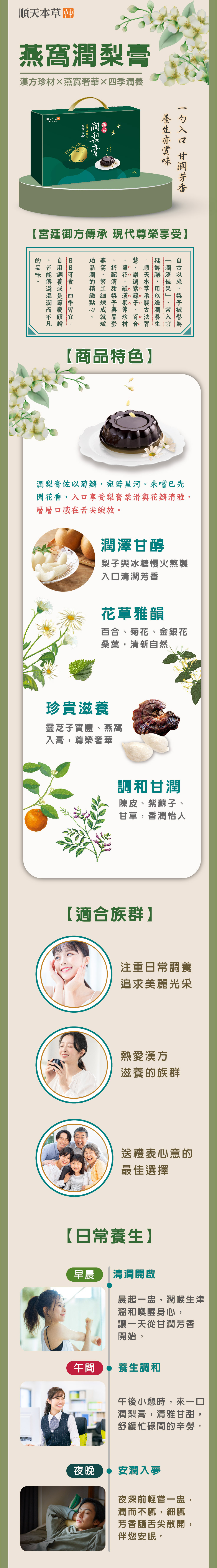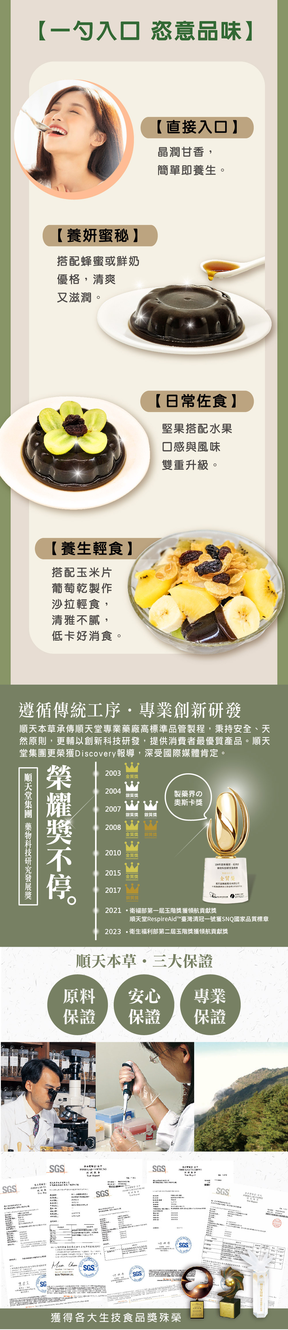 水、仙草原汁(水、仙草乾、碳酸鈉)、糖、樹薯澱粉、在來調合粉(在來米粉、非基改玉米澱粉、小麥澱粉)、羧甲基纖維素鈉、紫蘇子、陳皮、桑葉、百合、椰漿粉(新鮮椰漿80%、木薯澱粉、牛奶蛋白質、磷酸鈣)、羅漢果、仙草膠粉(仙草、碳酸鈉、水)、甘草、菊花、乾薑、金銀花、靈芝子實體 (Ganoderma lucidum(Leyss.:Fr.) Karst.固態栽培)、梨子、冰糖燕窩(水、冰糖、燕窩)