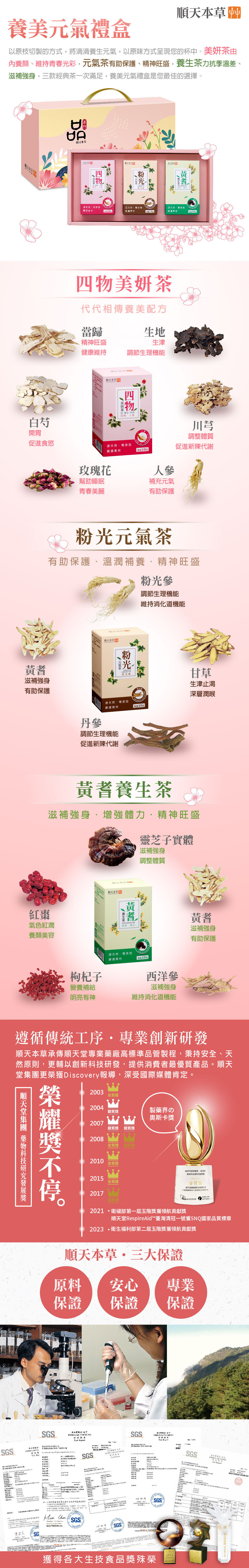 四物美妍茶:當歸、川芎、白芍、生地、熟地、甘草、鹹橄欖、玫瑰花、人參 粉光元氣茶:粉光參、黃耆、甘草、丹參 黃耆養生茶:紅棗、黃耆、枸杞、西洋參、靈芝子實體(固態栽培,Ganoderma lucidum (Leyss. : Fr.) Karst.)